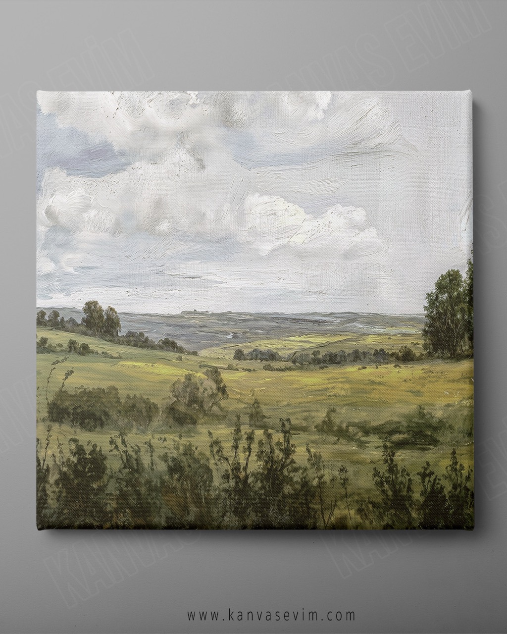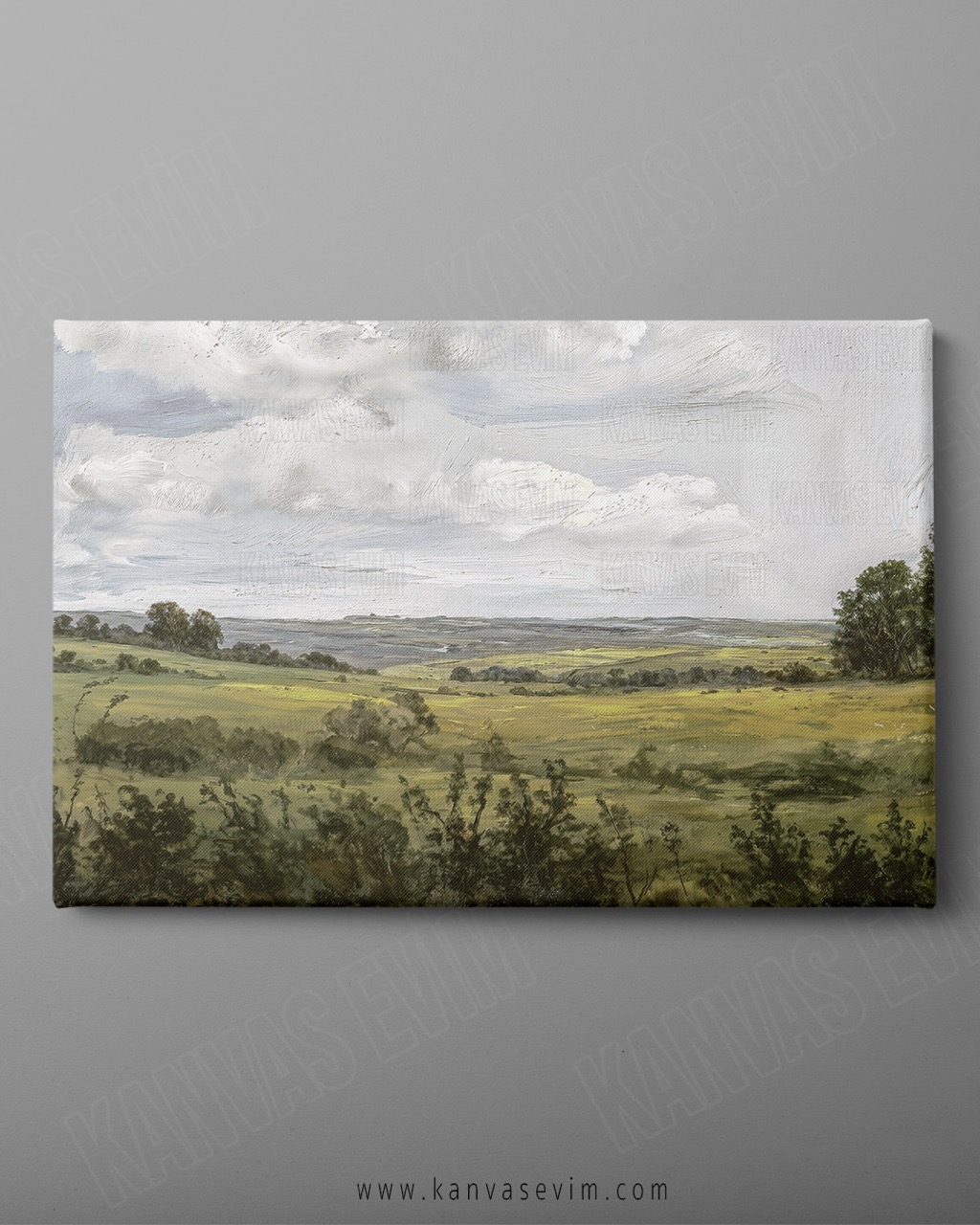 yeşil ova ve bulutlu gökyüzü kanvas tablo, içini ferahlatan sakin bir manzara gibi… 🌿